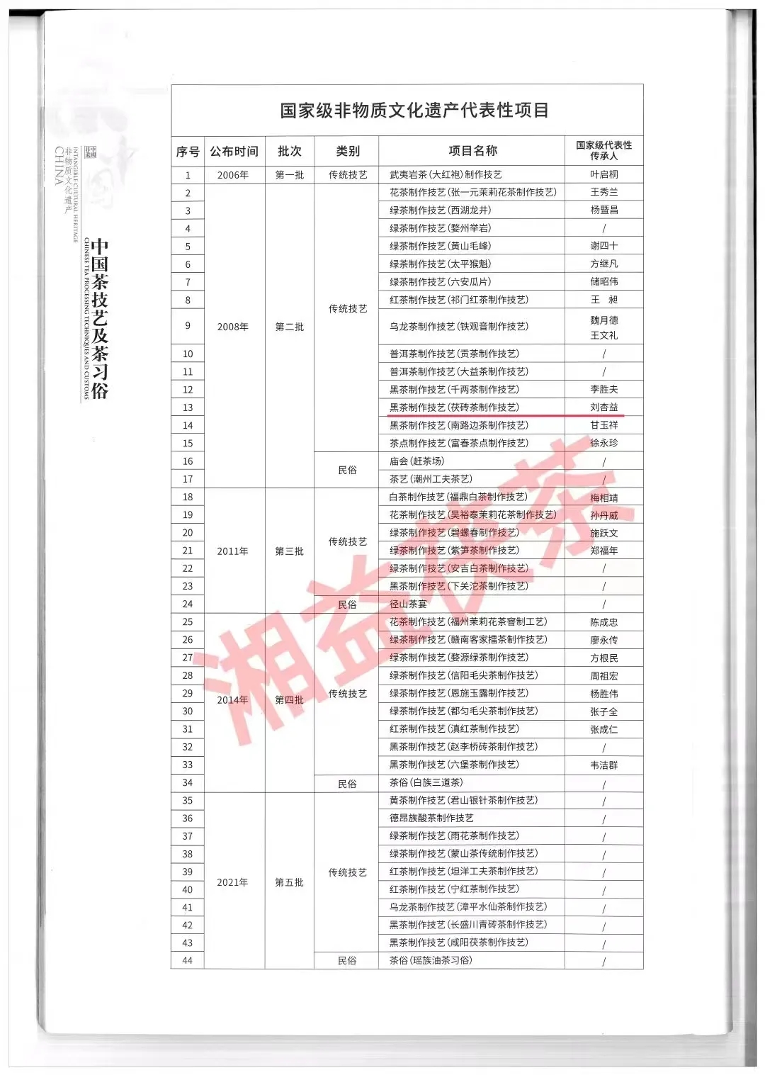 11月29日晚,我國申報的“中國傳統制茶技藝及其相關(guān)習俗”在摩洛哥拉巴特召開(kāi)的聯(lián)合國教科文組織保護非物質(zhì)文化遺產(chǎn)政府間委員會(huì )第17屆常會(huì )上通過(guò)評審,列入聯(lián)合國教科文組織人類(lèi)非物質(zhì)文化遺產(chǎn)代表作名錄。至此,我國共有43個(gè)項目列入聯(lián)合國教科文組織非物質(zhì)文化遺產(chǎn)名錄、名冊,居世界第一。益陽(yáng)茯磚茶制作技藝也被列入其中。 “中國傳統制茶技藝及其相關(guān)習俗”是有關(guān)茶園管理、茶葉采摘、茶的手工制作,以及茶的飲用和分享的知識、技藝和實(shí)踐。自古以來(lái),中國人就開(kāi)始種茶、采茶、制茶和飲茶。制茶師根據當地風(fēng)土,運用殺青、悶黃、渥堆、萎凋、做青、發(fā)酵、窨制等核心技藝,發(fā)展出綠茶、黃茶、黑茶、白茶、烏龍茶、紅茶六大茶類(lèi)及花茶等再加工茶,2000多種茶品,供人飲用與分享,并由此形成了不同的習俗,世代傳承,至今貫穿于中國人的日常生活、儀式和節慶活動(dòng)中。