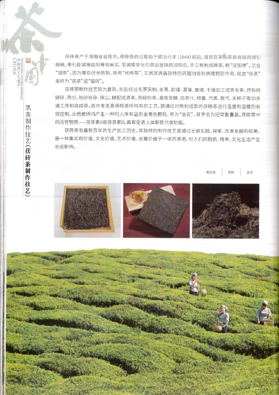 湖南黑茶是指采用湖南雪峰山脈泛區域茶葉為原料,在經(jīng)殺青、揉捻、渥堆、(復揉)、干燥等幾道工藝加工而成黑毛茶的基礎上再精制加工而成的黑茶成品。其品類(lèi)包括“四磚三尖一卷”,即茯磚茶、黑磚茶、青磚茶、花卷茶、天(貢、生)尖茶和千兩茶。其中尤以富含“金花”(冠突散蘘菌)的茯磚茶獨具特色。