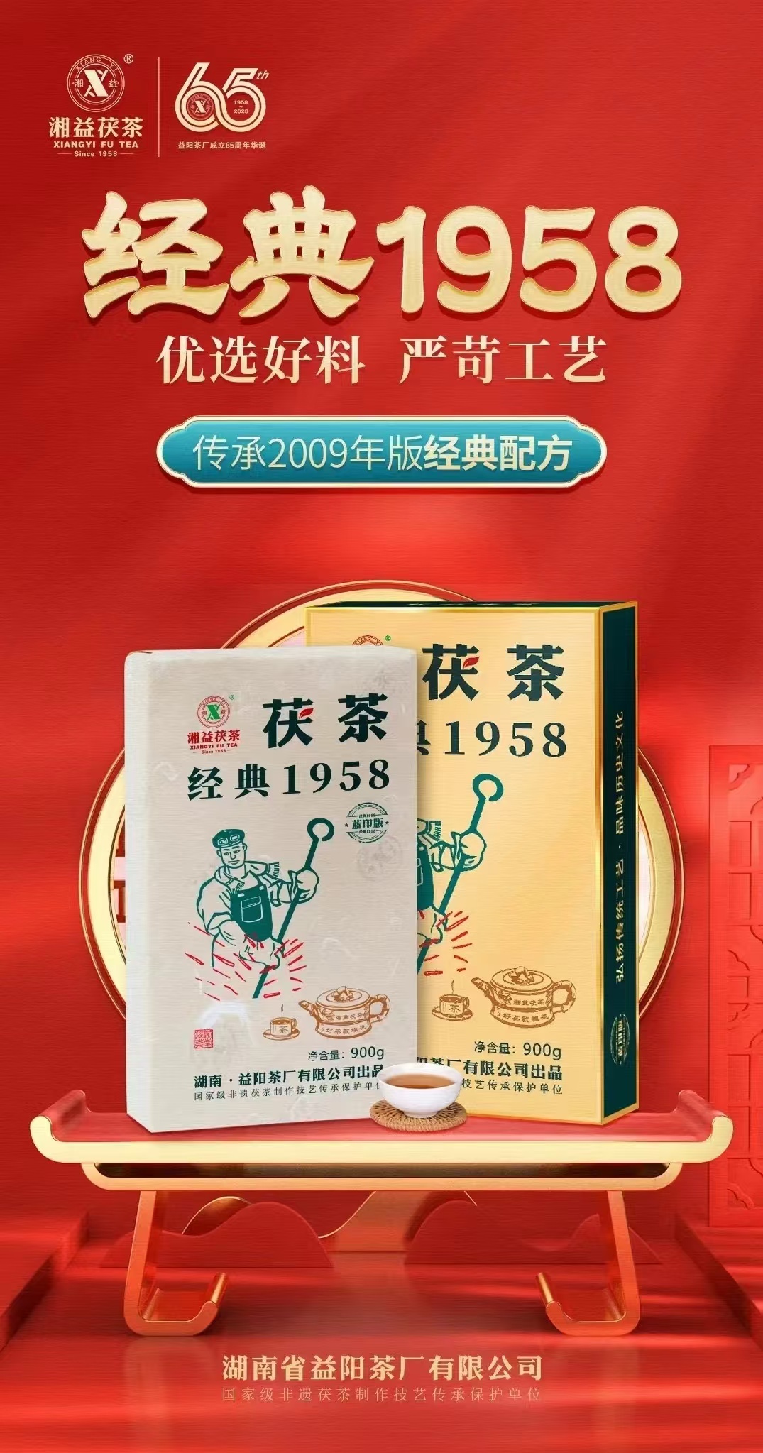 〖經(jīng)典1958(藍?。┸虿琛骄x雪峰山脈核心產(chǎn)區優(yōu)質(zhì)黑毛茶為原料。不管是鮮葉采摘、殺青揉捏,還是渥堆發(fā)酵等工藝環(huán)節,劉大師及其制茶團隊都嚴苛把控,精益求精,以確?!冀?jīng)典1958(藍?。┸虿琛奖3衷撚械捻嵨杜c口感。