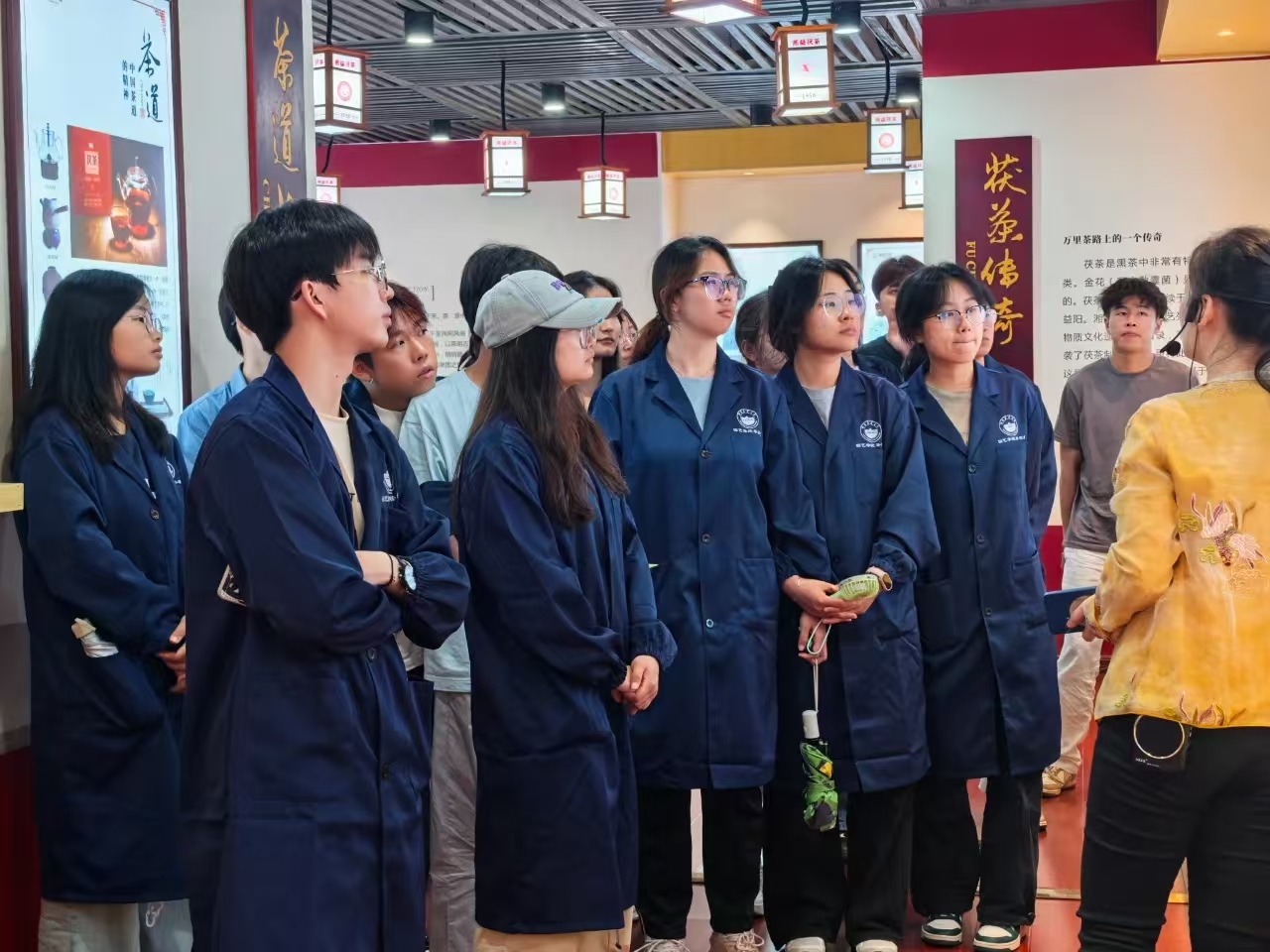師生們首先實(shí)地參觀(guān)了湘益生產(chǎn)線(xiàn)與茶博館。在生產(chǎn)車(chē)間,同學(xué)們親身感受益陽(yáng)茶廠(chǎng)標準化、現代化的生產(chǎn)流程,對茯磚茶的制作工藝有了初步直觀(guān)的了解。茶博館內陳列的一件件展品,則如同一部生動(dòng)的茶文化史書(shū),讓師生們沉浸式領(lǐng)略益陽(yáng)茶廠(chǎng)深厚的文化底蘊,探尋茯茶的前世今生,深刻體會(huì ) “一片茶葉承載的使命”。