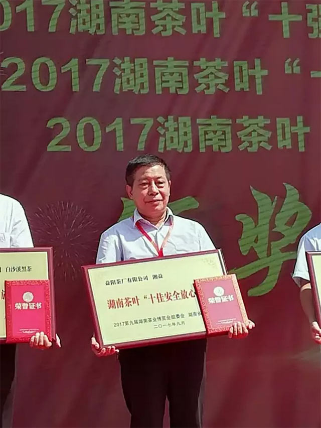 開(kāi)幕式上,湖南省人民政府政協(xié)副主席戴道晉宣布第九屆湖南“茶博會(huì )”開(kāi)幕。省領(lǐng)導為榮獲“2017湖南茶葉‘十佳安全放心品牌’‘十強生態(tài)產(chǎn)茶縣’‘十佳茶旅景區’”單位授牌頒獎。湘益茯茶榮獲湖南茶葉“十佳安全放心品牌”榮譽(yù)稱(chēng)號,公司副總經(jīng)理、國家非遺茯磚茶技藝代表性傳承人劉杏益先生上臺領(lǐng)獎。