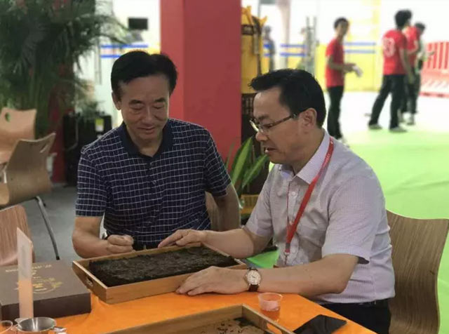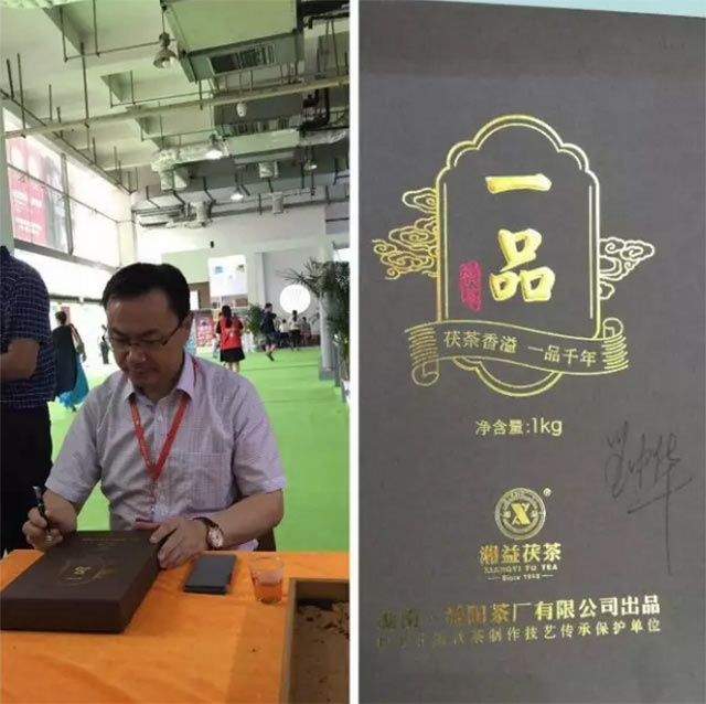 湖南農業(yè)大學(xué)博士生導師劉仲華教授蒞臨展位,與湘益茯茶湖南省代理商熊志偉先生共同品鑒公司新品“1kg一品茯茶”,劉仲華教授對“1kg一品茯茶”贊賞有加并親筆簽名。